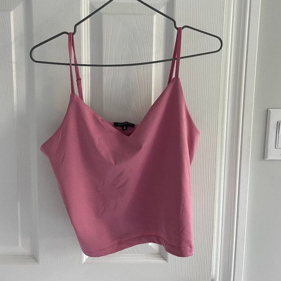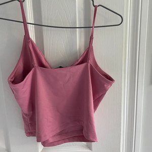Pink tank with spaghetti straps and silk like material. Low v-neck. In great condition.