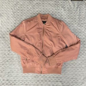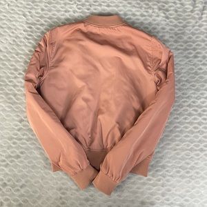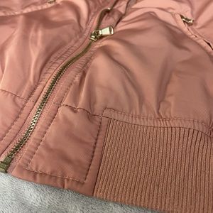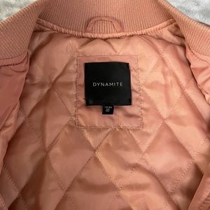 This pink Dynamite bomber is a stylish addition to any closet. The bright colour of the jacked is complimented by the gold colored zippers. The elastic portions of the bomber around the sleeves and waist ensure it fits perfectly on any body shape. The quilted inside of the jacket is not only stylish but also super warm.