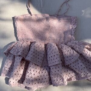 Charming pink top with eyelet design and ruffle details. Perfect for a casual outing.