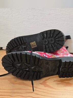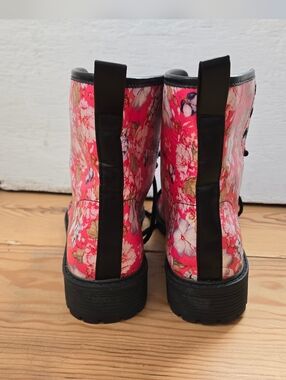 Bright, bold, and so fun for spring outfits, these pink floral combat boots add the cutest statement pop to jeans, dresses, or festival looks. Lace-up front with black trim, pull tabs, and chunky tread soles for that classic edgy-meets-feminine vibe. Labeled EU 40, approximately US women’s 9 for an easy fit reference. Great preowned condition with light wear to soles as shown.