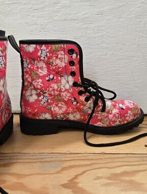 pink floral boots, floral combat boots, pink ankle boots, lace up boots, spring boots, statement boots, cottagecore shoes, festival boots, edgy floral boots, chunky sole boots, kawaii boots, women’s fashion boots, bold print boots, cute combat boots, multicolor floral shoes