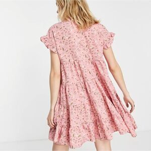 Feminine Effortless and Airy Pink Floral sprig & leaf Print Tiered Babydoll Mini Dress with Frilly Cap Sleeve, 'Love at First Scroll' by VILA from ASOS.