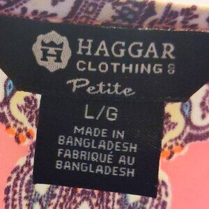 This is a Haggar Pink Floral Blouse with Full Length Sleeves. It is a size L and is made of 100% Polyester. It is also machine washable and in amazing condition!