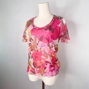 ⋆ Sheer flower printed t-shirt featuring large pink flowers with green stamps & hues of pastel pink / yellow & brown. This blouse has a lettuce ruffle hem w/ a magenta underlayer. Perfect for a casual summer look or as a beach cover-up.