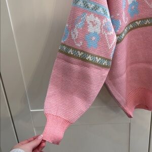 Stay cozy and stylish with this pink floral patterned sweater. Perfect for adding a touch of color to your wardrobe.