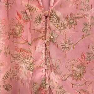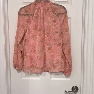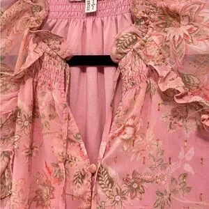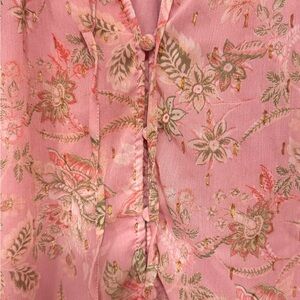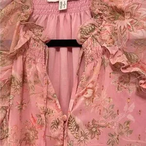 This chic pink blouse features a delicate floral pattern and elegant ruffle details. Perfect for adding a touch of femininity to your wardrobe.