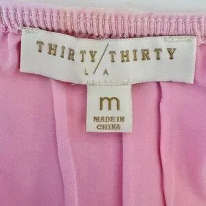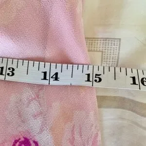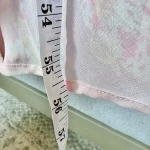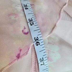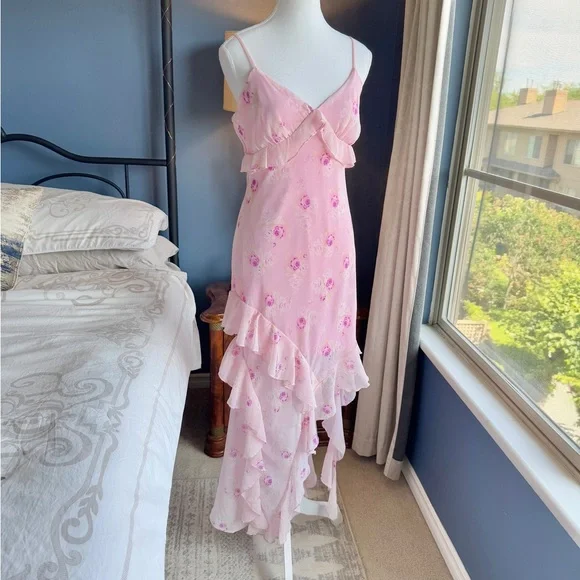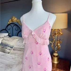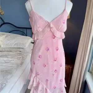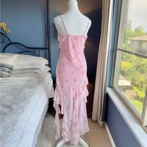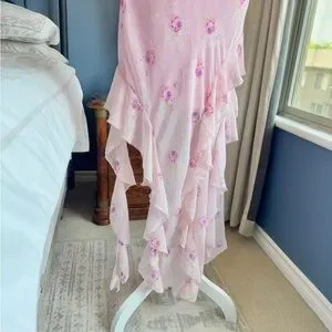 Baby pink floral ruffle dress by thirty/thirty LA, size M. Lined, adjustable spaghetti straps, sweetheart neckline, midi-maxi length with flowy ruffles and material. Excellent used condition. All measurements have some stretch because of material. Bust measures 16.75 inches laying flat, waist is 15 inches flat, hips 19.25 inches flat, length from top of shoulder to hem is about 36 inches to 56 inches with tassels. Cat friendly, nonsmoking home.