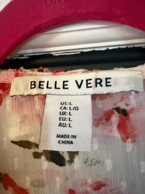 pink floral blouse with feminine ruffle detailing. Lightweight, flowy fabric with all-over pink and red blooms. V-neck wrap styling and soft long sleeves for an elegant, feminine look.