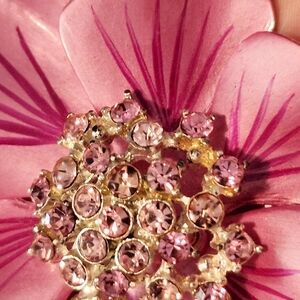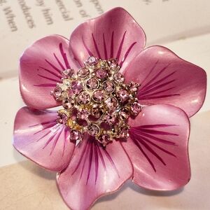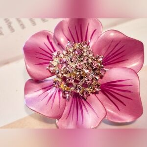 Elegant pink floral brooch adorned with sparkling crystals. Perfect for adding a touch of glamour to any outfit.