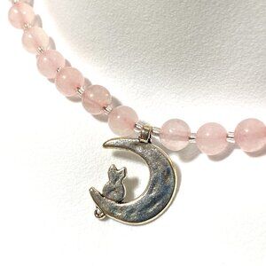 Pink Genuine Gemstone Rose Quartz Silver Cat on the Moon Beaded Short Necklace