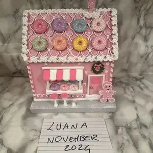 Charming pink gingerbread house with colorful donut decorations. Perfect for holiday decor.