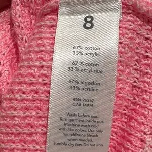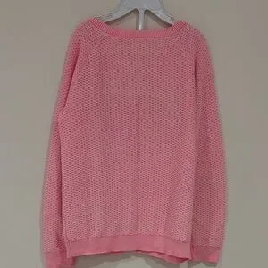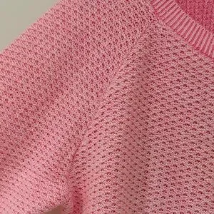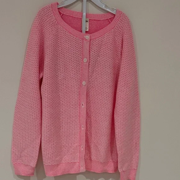 Lightweight pink knit cardigan with a round neckline and full button front. Soft, breathable texture for comfortable everyday wear. Versatile layering piece that pairs well with casual or dressy outfits.