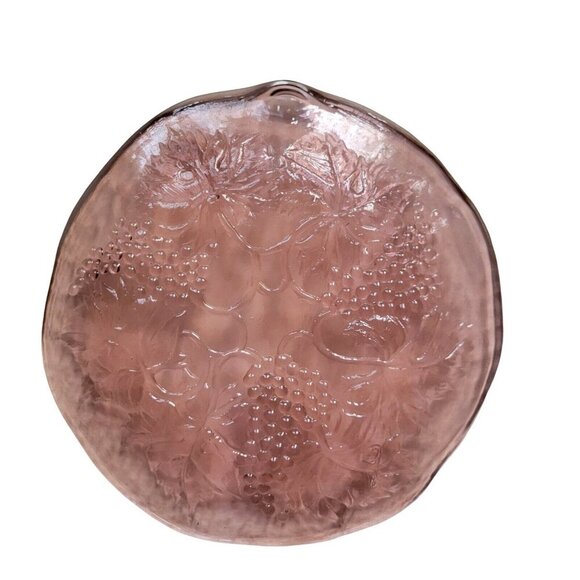 Pink Glass Plate with Embossed Grapes and Leaves 9" Diameter Wavy Edge 742 grams