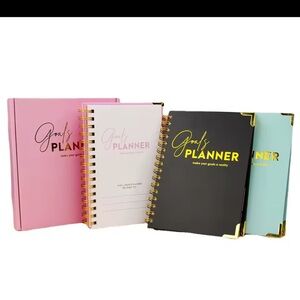 Stylish pink planner with gold lettering. Perfect for organizing your goals.