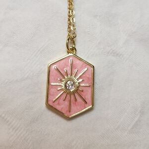 Pink enamal & Gold Art Deco style Geometric double sided Pendant with star burst Rhinestone center.