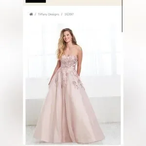 Tiffany Designs 16397 is a sweetheart, strapless prom dress with a metallic lace applique on a full A-line tulle skirt. It is a popular style for events like prom or homecoming