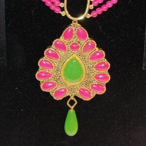NECKLACE: Multi strand pink bead necklace with gold, jade and pink jade bead work. The clasp on the necklace is a slide bar. Multi-bead strap is made from two separate bead strands of 8 strands each with stability gold bar to maintain desired neck shape. The bead pendant is 3 inches in length. Total necklace length is approx. 13 inches. Total length will vary as the necklace is designed to hug the collar bone of the person wearing the necklace. This is a a true statement piece. Set was purchased in China while on vacation for $40 USD in the 80s.