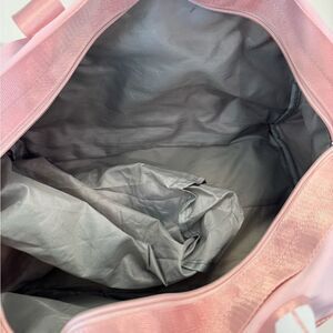 This bag combines a soft pink exterior with a contrasting gray interior, crafted from a sleek, synthetic fabric that offers a subtle sheen. Its compact design makes it an ideal choice for carrying essentials while on the go, ensuring both style and practicality.