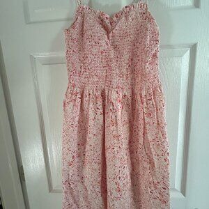 Pink foral calf-length dress in a cotton weave with detachable, adjustable spaghetti shoulder straps and a smocked bodice featuring a frill-trimmed sweetheart neckline and an elasticated seam at the centre of the bust. Gathered seam at the waist and a gently flared skirt. Unlined.