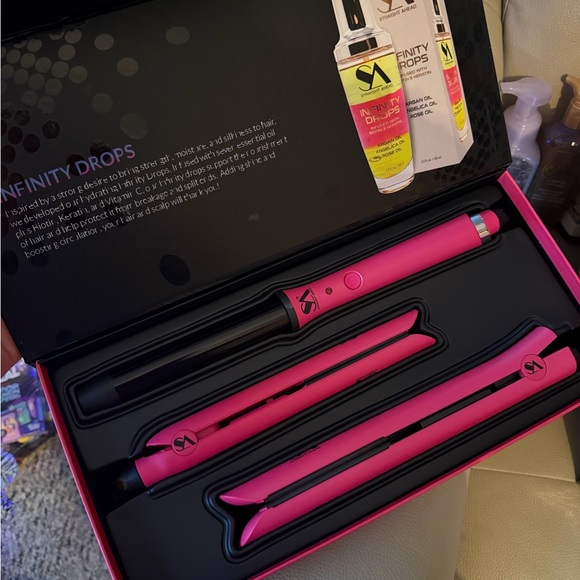 Versatile pink hair styling set with curling wand and straightener. Ideal for creating various hairstyles.