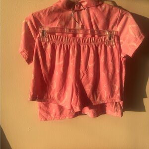 Charming pink button-up shirt with a heart pattern. Short sleeves and a classic collar add a cute touch.