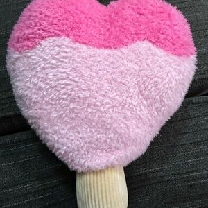 Adorable pink heart-shaped plush pillow with a cute face. Perfect for cuddling or decor.