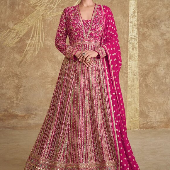 Top Length: 57 inches (approx. 145 cm) Color: Pink Fabric: Premium Georgette Occasion: Festival Wear | Wedding Functions | Engagement | Party Wear | Reception | Bridesmaids Style: Designer Anarkali Gown – Perfect for Wedding & Festive Wear Work: Intricately Embroidered with Multi-Thread Zari and Sequins Detailing