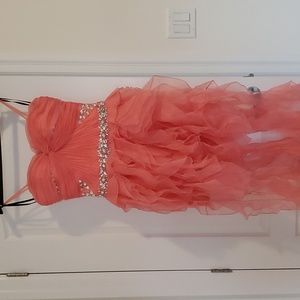 This dress is a high low, its short but has the long frills that continue down the dress. It's been worn one time so not in perfect condition (the bottom of the dress is a bit dirty because it touched the ground) but other than that there are no stains or rips. I tried to get pictures in the natural light to show the colour, its a bit of a pinky salmon depending on lighting. The back is a zipper until the waist and then its a corset tie above the waist.