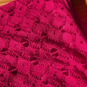 The fabric on top appears made up a crochet stitch, and the fabric underneath appears to be soft polyester.