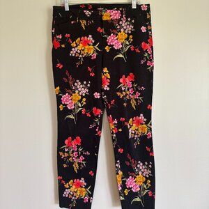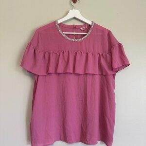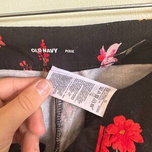 This perfect pink blouse and pixie pant set is made up of the brands Juicy Couture and Old Navy. The blouse is loose and flowy, has a cute ruffle at shoulder height that runs around the entire blouse. The neckline is decorated in silver and crystal's. The pants are the classic pixie style from old navy, they feature a floral design