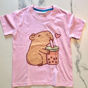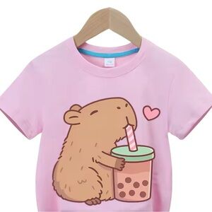 Pink Kids T-Shirt with Capybara & Bubble Tea Print