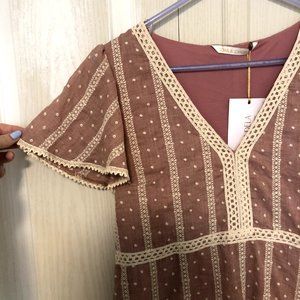 Pink midi dress with lace detail and tie back to cinch the waist. It has short flutter sleeves and it is fully lined. Perfect condition, brand new with tags. Smoke-free, pet-free home.