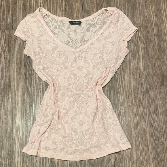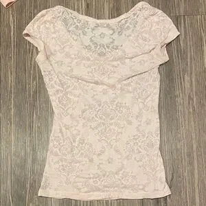 Elegant pink lace top with short sleeves. Perfect for casual or dressy occasions.