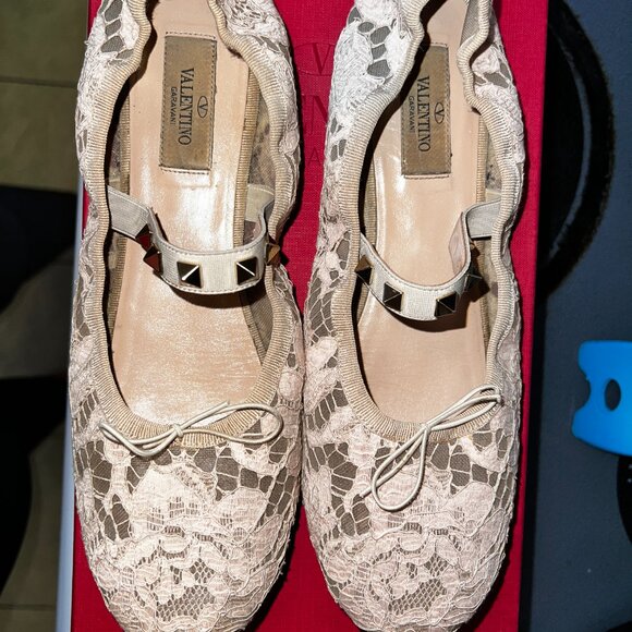 Pink Lace Valentino Garavani Rockstud Ballerina Flats with Studded Strap, in good condition. Size 39 1/2. Although the box indicates size 39, the bottoms of the flats themselves indicate size 39 1/2 - please see pictures for reference.