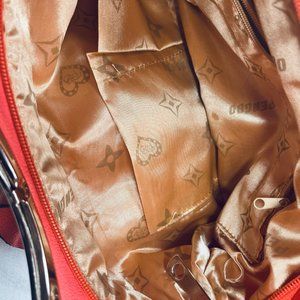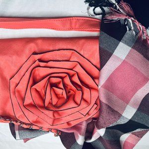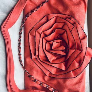 Pink Leather Modern Crossbody bag with Rose. Used once. Like new. Two belts. Two zipped pockets. Two small pockets inside. Gold linen. 33 x 33 cm.