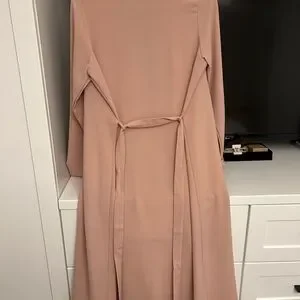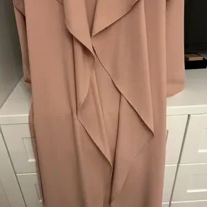Stylish long coat in a soft pink hue. Features a draped collar and matching belt.
