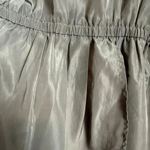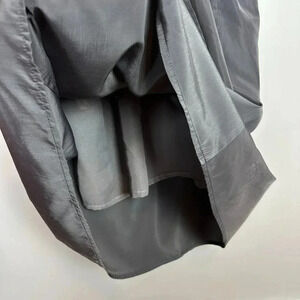 This lightweight, grey dress appears to be different colors depending on how the light hits it. It can appear silvery or more like a charcoal color. The bodice features princess seams for shaping, an elasticized waist, understitched facings, pleats on the back of the skirt and no centerback seam as the skirt overlaps at the back. The dress is fully lined and super comfortable to wear. 100% Rayon