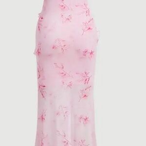 This stunning pink maxi dress features a soft, pastel hue and a flowing chiffon-like fabric. The asymmetrical design is accentuated by multiple layers of ruffled edges, creating a romantic and feminine look. A high slit adds a touch of allure, revealing a lighter pink or white underskirt beneath.