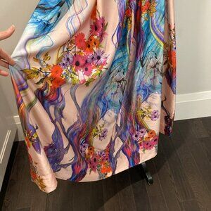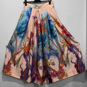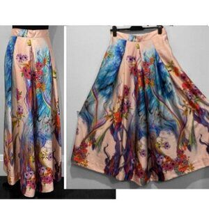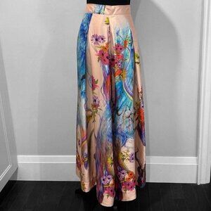 This women's maxi skirt features a pleated design and a vibrant, multicolored floral and abstract print on a peach-colored satin-like fabric. The skirt's length is approximately floor-length, and the fabric has a subtle sheen. The print is detailed and includes various shades of blue, pink, purple, and green. The skirt is likely suitable for formal or semi-formal occasions.