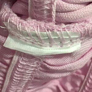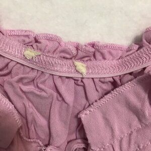 Pretty, dusty rose milk maid style blouse with elasticized cuffs and neckline, tie front, sweetheart neckline, balloon sleeves and smocked waistline.