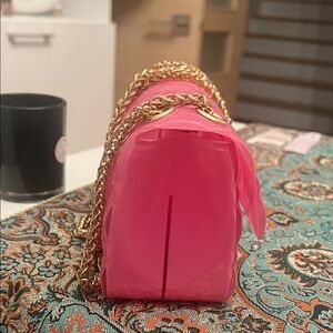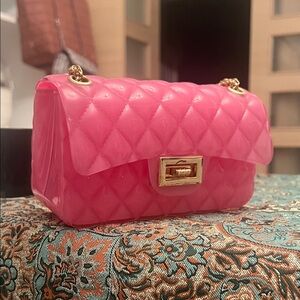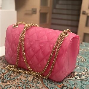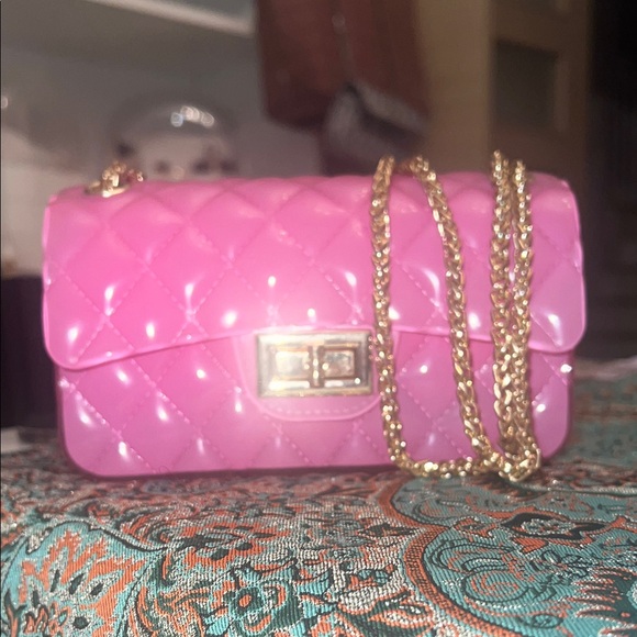 Stylish pink pvc quilted bag with a chic chain strap, perfect for any occasion.
