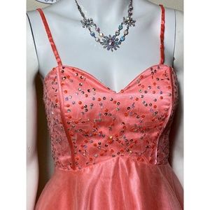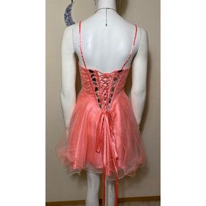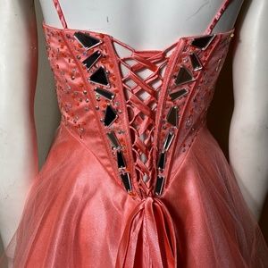 Purchased new and worn once, this dress is so adorable (perfect for a Quinceañera or Graduation). The skirt has 3 layers on top of the sateen and one underneath for a total of 5 layers, zipper down the side and lace up back with mirrored accents. Size tag says XS, but fits more like a small-medium as back lace up can be adjusted to fit (mannequin is a size 6). Comes with a set of shoulder straps and jewelry as pictured above. Listed here as a size Small.