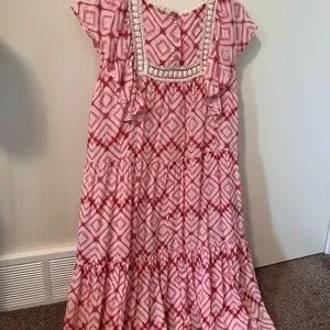 Charming pink patterned dress with delicate lace detailing. Perfect for any occasion. Especially this summer!