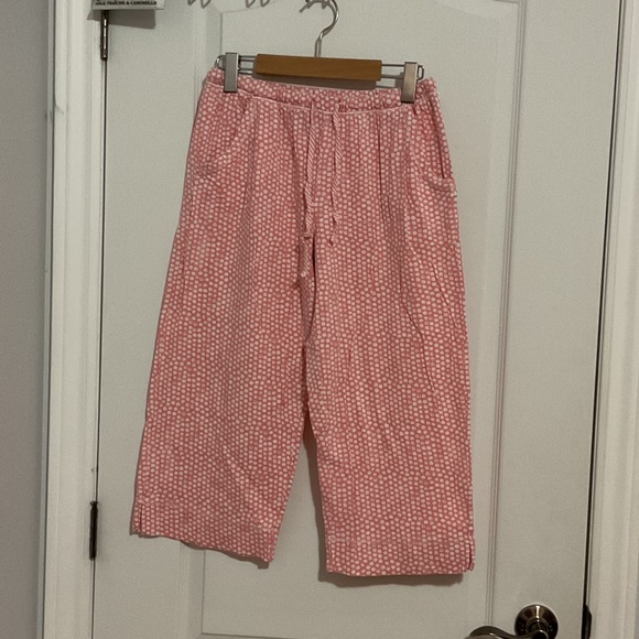 Stylish pink cropped pyjama pants with a subtle pattern. Features a drawstring waist for comfort.
