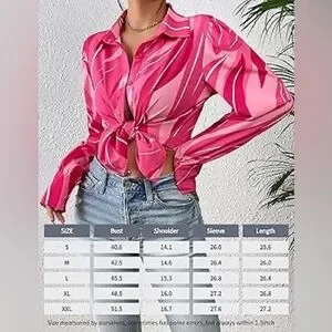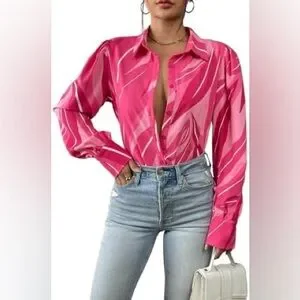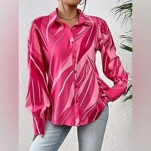 Make a statement with this vibrant pink abstract swirl blouse! Featuring a chic collared neckline and dramatic puff sleeves with structured long cuffs, this top is perfect for the office, brunch, or a night out.