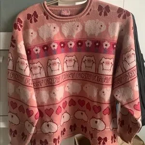 Stay cozy and cute with this pink piggy patterned sweater. Perfect for adding a playful touch to your wardrobe. From China and the tag is in Chinese so I’m unsure what brand it’s from. Decent condition.