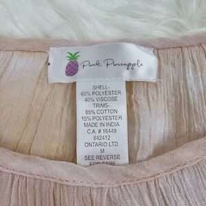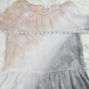 Lightweight boho style long sleeve top by Pink Pineapple. It features bell sleeves with lace detail at cuffs and bottom hem. The print is a pastel tie-dye cascading asymmetrically down the garment. The fit is loose and flowy. Size Medium.