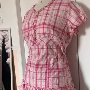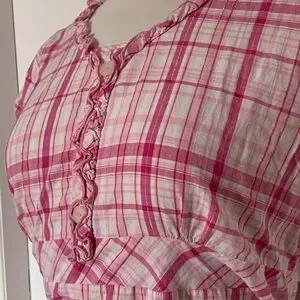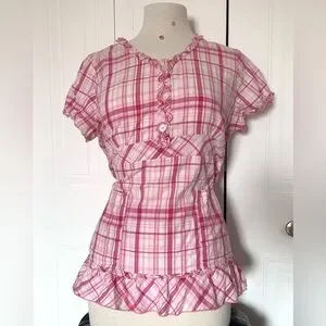 Delicate pink and white plaid scrub top. Feminine ruffle trim along the neckline. Soft, lightweight fabric and pretty stretchy!