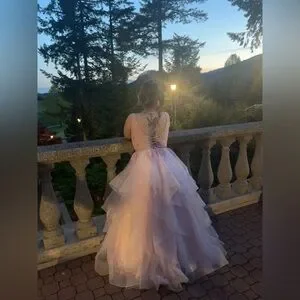 Beautiful pink prom dress, corset back, layered skirt, a couple small rips at the very bottom from walking which is normal and not noticeable, I’m 5”3 with heels 5”5 and it just gave me a nice little train at the back, size 10 dress fits for a 8-12 since there’s a corset back for a bit of adjustment.