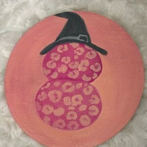 pink leopard print pumpkin Acrylic Painting wooden coaster with a black witch hat. Original by Artist Lise Marie. Perfect for Halloween decor and Coffee/Tea coaster